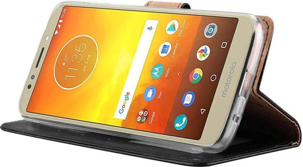 Een strak, functioneel en professioneel boekcase portemonnee hoesje in zwart, speciaal ontworpen voor de Motorola Moto E5 Plus. Deze hoes combineert dagelijkse bescherming met praktische opbergruimte, ideaal voor wie zijn smartphone intensief gebruikt op kantoor, onderweg of op locatie.