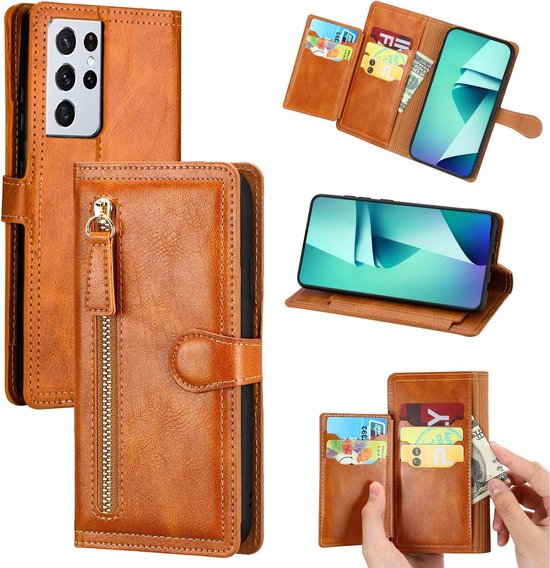 • Samsung Galaxy A13 5G / A04s Hoesjes – Bookcase Portemonneehoes – Ritssluiting – 5 Pasjeshouder – Lichtbruin
