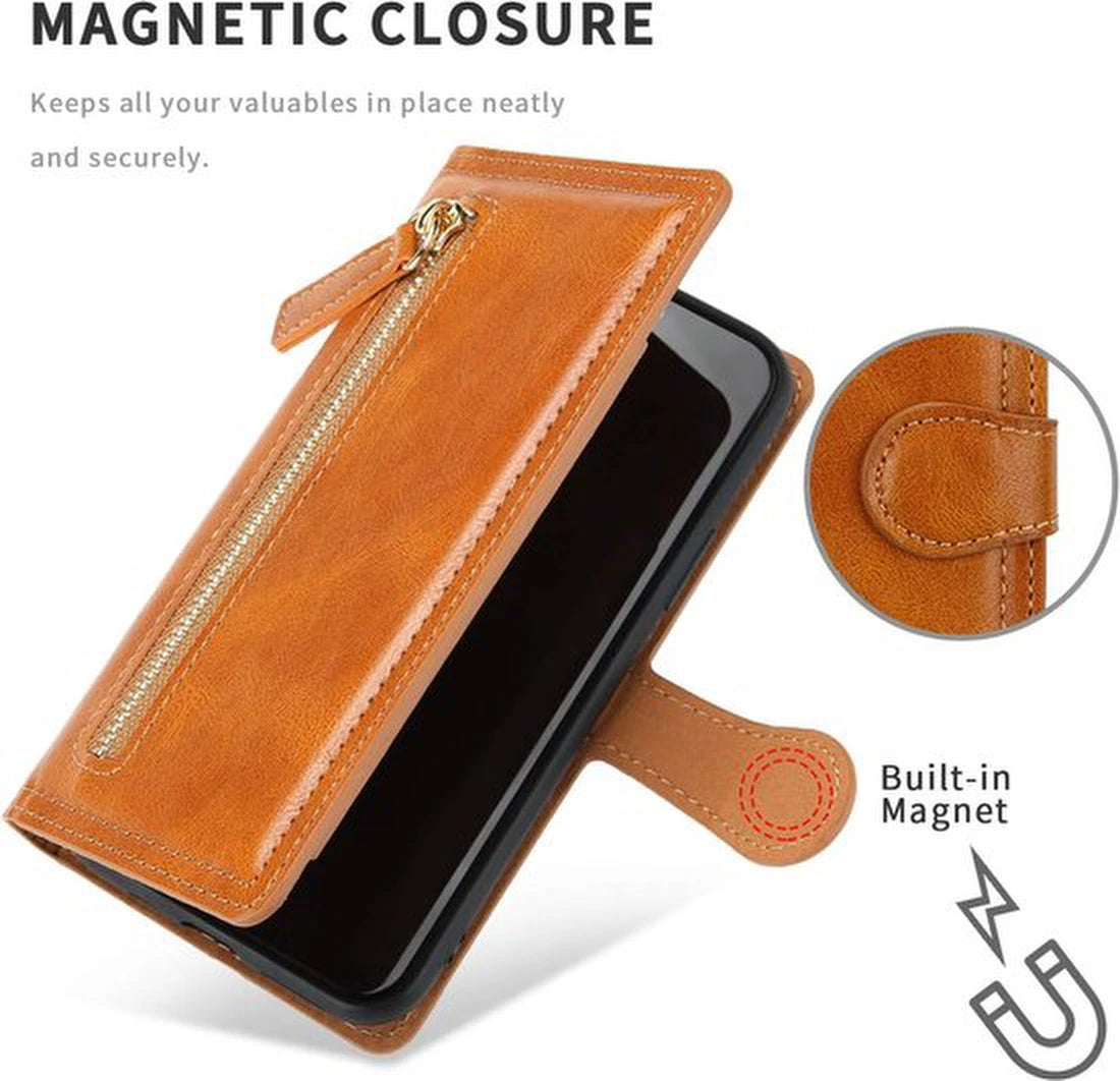 Deze lichtbruine bookcase hoes met ritssluiting is ontworpen voor wie zijn smartphone professioneel inzet en maximale bescherming én organisatie wil in één accessoire. De flipcover sluit rondom af en helpt je toestel beter te beschermen tegen dagelijkse risico’s zoals krassen in je tas, stoten op kantoor of vuil tijdens woon-werkverkeer.