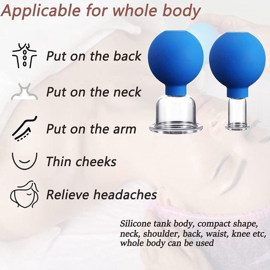 Dankzij het siliconen materiaal werk je met een prettige, huidvriendelijke grip en kun je de zuigkracht nauwkeurig “doseren” door simpelweg meer of minder te knijpen. Dat maakt deze set geschikt voor zowel kleine, gevoelige zones (zoals de contour rond de ogen) als grotere oppervlakken (zoals wangen, kaaklijn, nek of lichaamszones waar je anti-cellulite massage wilt toepassen).