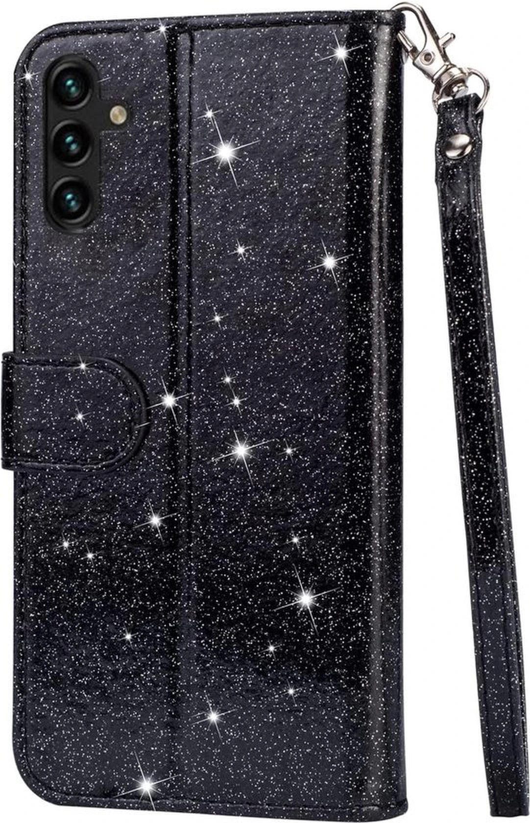 • Glitter Wallet Case Geschikt voor: Samsung Galaxy A05s Hoesje met Rits, Koord en Pasjeshouder - Zwart