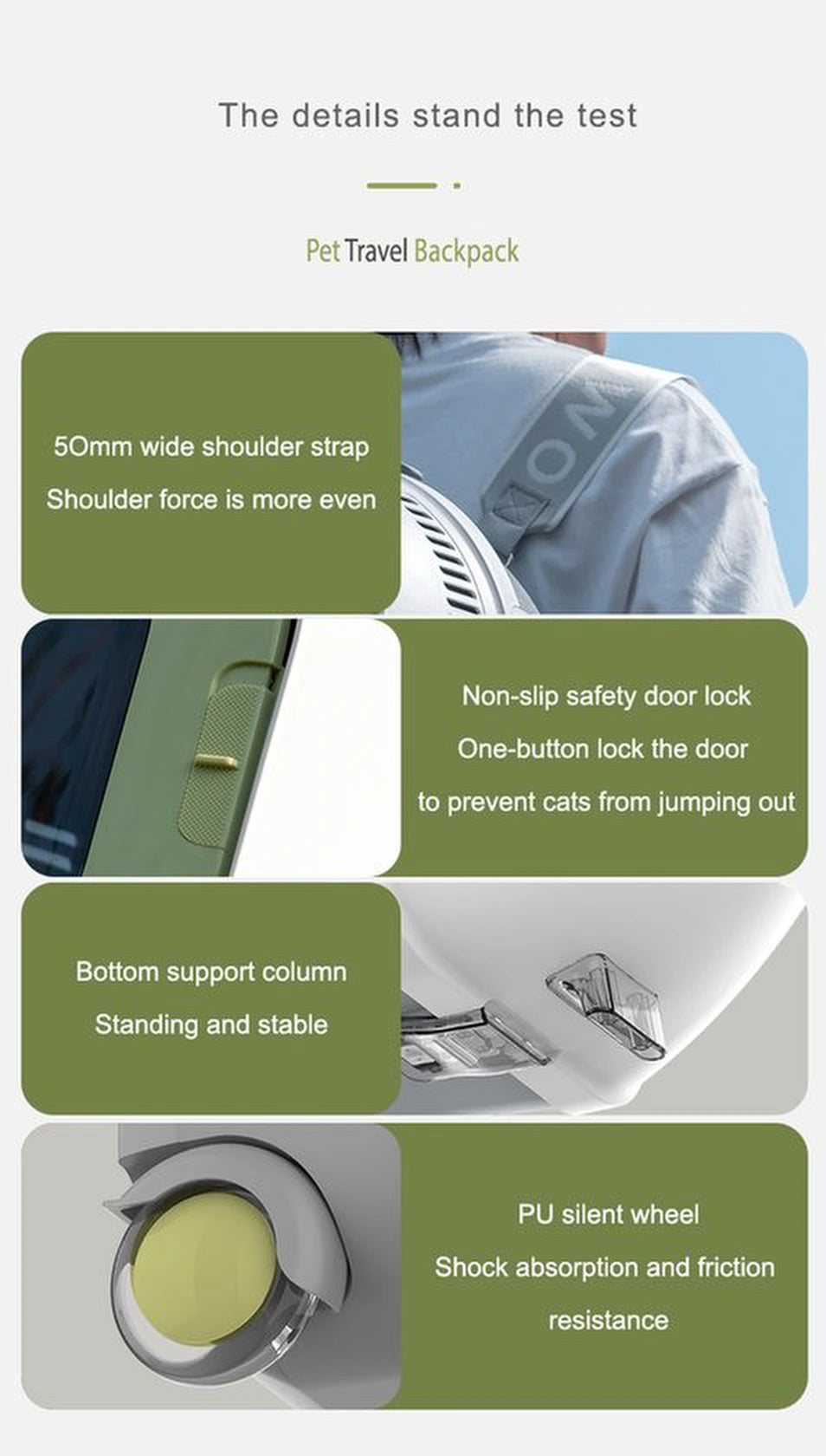 Dankzij de zwenkwielen manoeuvreer je soepel door gangen, perrons en winkelstraten. Het gewicht blijft laag aan je schouders en rug, terwijl je huisdier rustiger blijft doordat schokken en wiebelen beperkt worden. Moet je een trap op, het OV in of door een smalle doorgang? Dan wissel je in één beweging naar rugzakmodus voor maximale controle en stabiliteit.