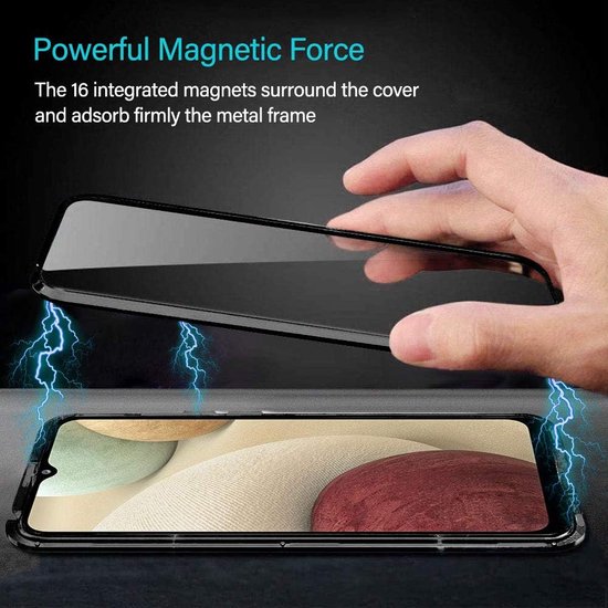 Samsung Galaxy A12 Hoesjes – Magnetische 360° Bescherming – Metalen Frame – Gehard Glas Achterkant – Transparant/Zwart