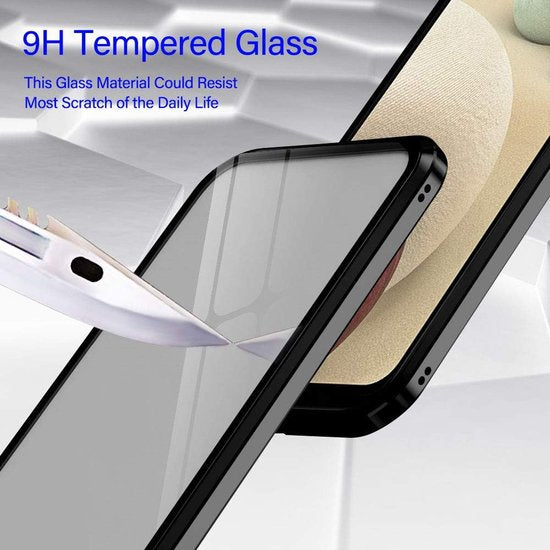 • Samsung Galaxy A22 4G Hoesjes – Magnetische 360° Bescherming – Metalen Frame – Gehard Glas Achterkant + Screenprotector – Zwart