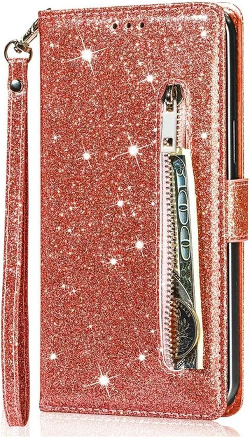 Zeg dag tegen losse pasjes en een onhandige telefoon in je hand. Dit portemonnee hoesje met rits combineert bescherming, organisatie en draagcomfort in één premium wallet case. De roségouden sparkly glitter-afwerking geeft een professionele, stijlvolle look, terwijl de praktische indeling je Samsung Galaxy A25 (4G & 5G) dagelijks efficiënter maakt, op kantoor, onderweg en tijdens afspraken.