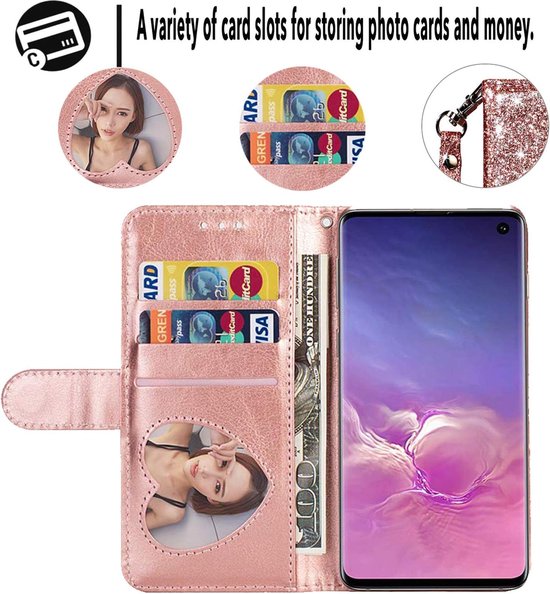 • Sparkly Glitter Wallet Hoesje met Rits & Koord Geschikt voor: Samsung Galaxy S10E - Roségoud