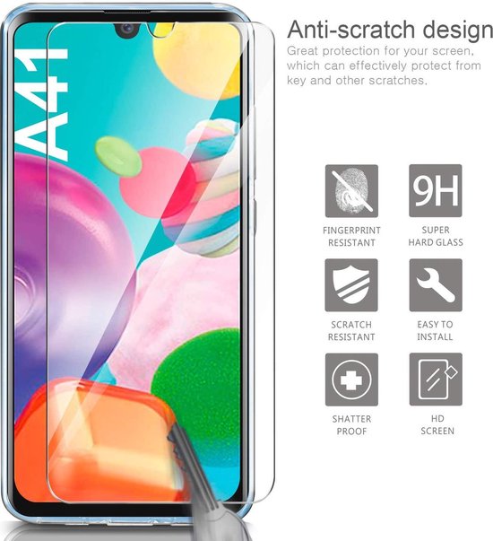 De pasvorm is ontworpen voor de Samsung Galaxy A41, met nauwkeurige uitsparingen zodat poorten, speakers en knoppen functioneel blijven. De case sluit strak aan, biedt extra grip en helpt het toestel beter bestand te maken tegen alledaagse impact. De glazen screenprotectors leveren een harde beschermlaag bovenop je display, zodat je minder kans hebt op blijvende schade bij kleine val- of stootincidenten.