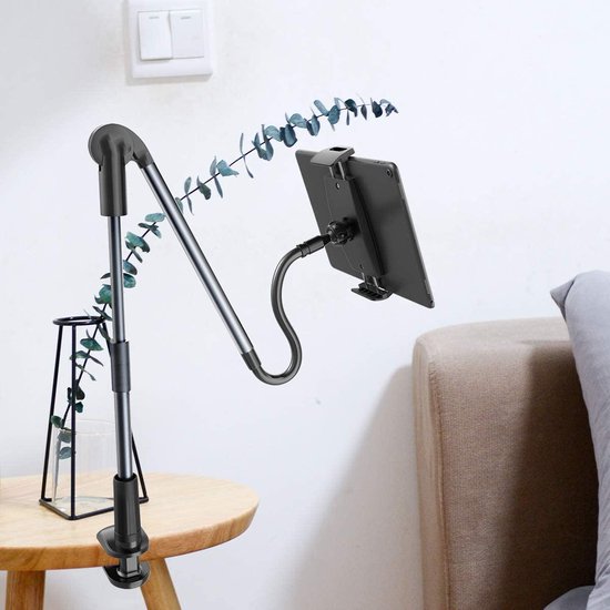 • Tablethouder bed – Lange arm zwanenhals – 360° draaibaar – Flexibele klemstandaard 4,7-10,5 inch – Zwart